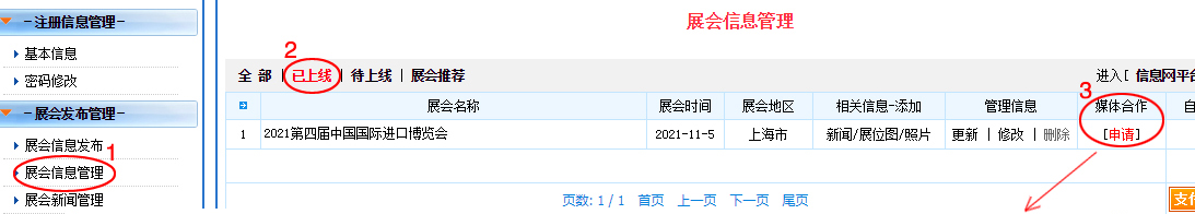 展会上线后,在展会信息管理栏,点击“已上线”,找到你发布的展会,点击“申请”(审核结果留意“站内信息”)。